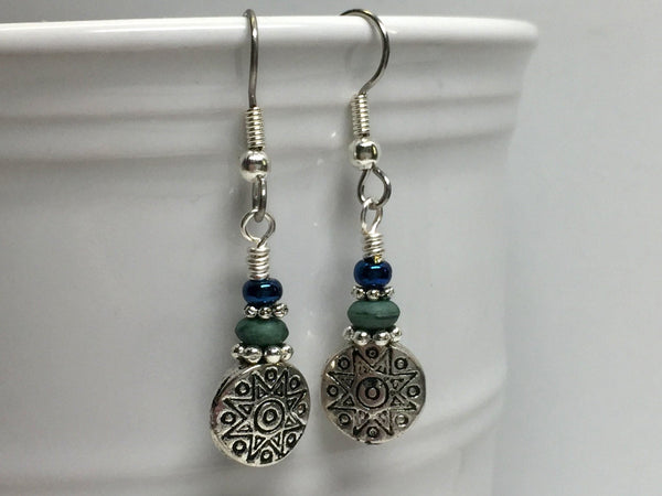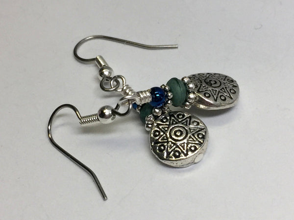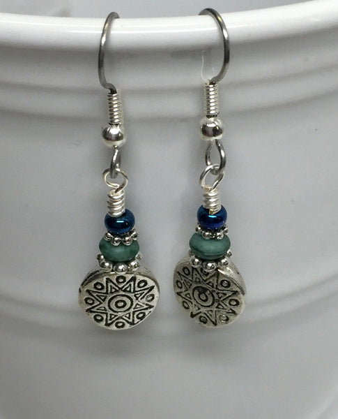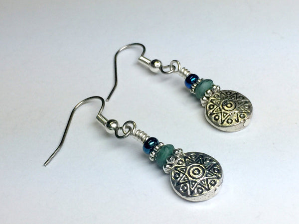 A great pair of earrings fit for any occasion. The Tibetan silver carved bead features and antique sun design with a very modern look. Prepare yourself for compliments.Earrings are made using surgical steel ear wires. I use wrapped loops to give a finished look. Earrings come with rubber ear backs that slide on to keep earrings from falling out of ears.