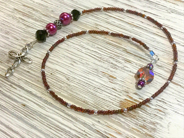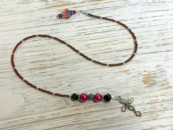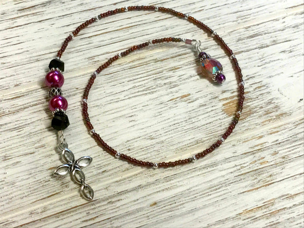 A bookmark featuring a cross charm on one end. It is made up of beautiful burgundy and pink beads strung on flexible bead wire. Beads are small so the bookmark fits nicely between the pages of your book.