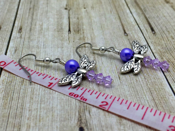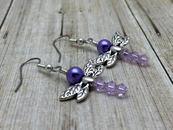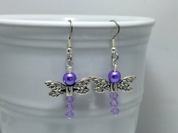 A super cute pair of dragonfly earrings fit for any occasion. The body of the dragonfly is made with Swarovski crystals and a purple glass pearl. A very modern look that will look great on you. Prepare yourself for compliments. Earrings are made using surgical steel ear wires. I use wrapped loops to give a finished look. Earrings come with rubber ear backs that slide on to keep earrings from falling out of ears.