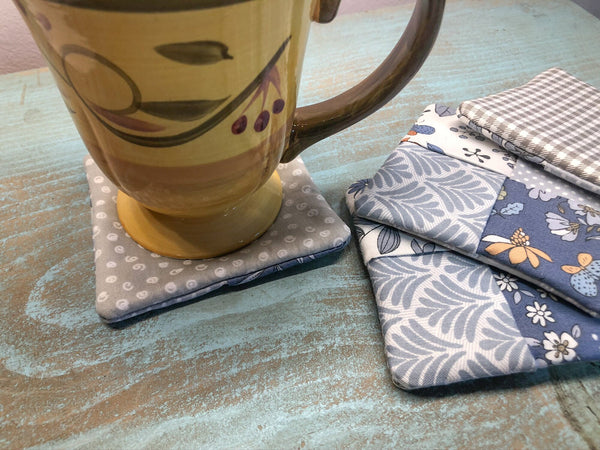 Set of four handmade cotton fabric coasters. Made with a layer of fleece inside for a thick durable coaster. Fabric is folded and overlapping on the front side and reversible with one fabric design on the back side.