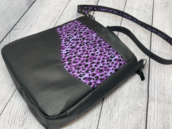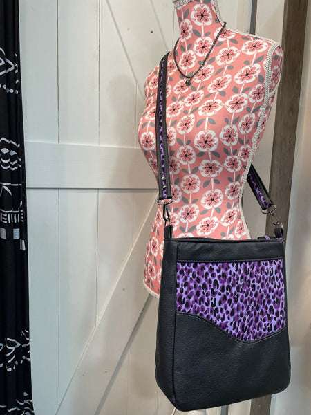 Purple leopard print and sleek black faux leather make this an attractive crossbody bag with unique features that will make heads turn! Ombak's main feature is the strong curve on the front of the bag giving it a very unique appearance. The same purple leopard print lines the inside of the bag as well. Get ready for compliments if you purchase this bag.