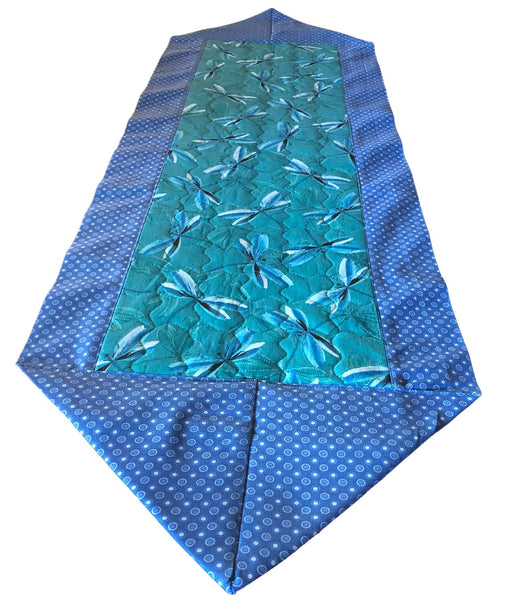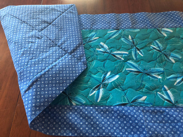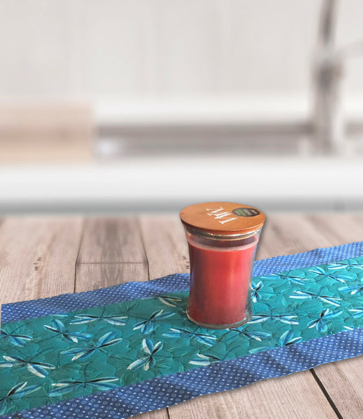 Dragonflies set on a teal background on this quilted table runner make it a must have. The runner is reversible for more than one look. Can be used on any table in your home. The perfect décor for your house or a great gift for someone else's.